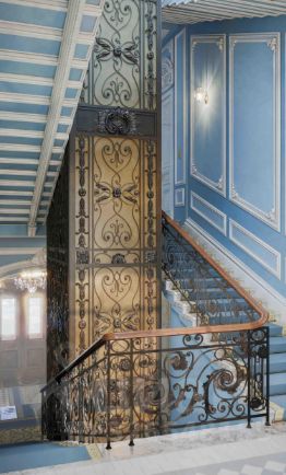 В интерьерах восстановлена лепнина начала XX века, воссозданы печи и камины, сохранена атмосфера исторической резиденции.