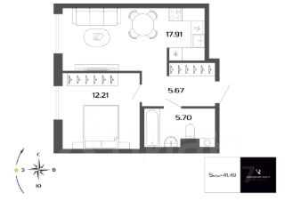 Кухня-гостиная 17,91 м². Спальня 12,21 м².