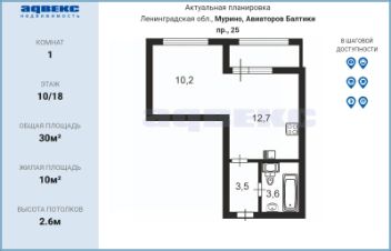 Квартира расположена на 10 этаже. Хорошая планировка. Окна выходят на восточную сторону. Общая площадь квартиры 30,1 кв.м., Большая кухня: 12,7 кв.м с выходом на лоджию, комната 10 кв. м. Санузел совмещенный с ванной- отделан плиткой.