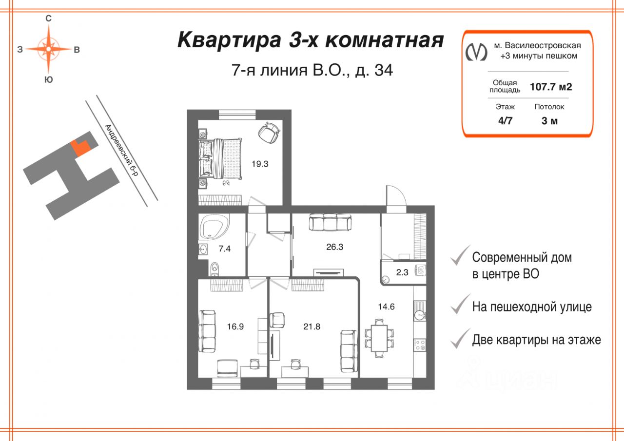 Вознаграждение для агентов 50/50. В 3-х мин ходьбы от метро Василеостровская в современном доме 2002 г.п предлагается великолепная 3-х комн. квартира с прекрасной планировкой: кухня, 3 изолированные спальни, 2 с/у, постирочная, кладовая. Преимущества: - Современный дом в центре ВО - На пешеходной улице - Две квартиры на этаже Квартира двухсторонняя, основной вид на восток и юг. Из окна кухни смотрим на купол Исаакиевского собора. Дом кирпичный, поэтому абсолютно тихо и тепло. Окна Schuco с двойным стеклопакетом и немецкой фурнитурой Winkhaus. Потолок 3,0 м. Вся отделка в светлых тонах. На стенах краска из Германии и в отдельных местах сделаны акценты из красивых экологичных итальянских обоев. По всей квартире на полу финский паркет из березы. Все межкомнатные двери в едином стиле под ясень, с вставками из стекла и фурнитурой AGB. Все, что есть в квартире остается новому собственнику. Все обустроено по авторскому дизайн-проекту. На кухне мебель Geba из Германии в современном стиле. Встроенная техника: плита, духовой шкаф, ПММ Bosch, холодильник Aeg. Итальянская вытяжка Falmec. Фильтры воды, смеситель Esko. Удобные стулья и большой стеклянный стол из Финляндии. 3 спальни обустроены в разных стилях с использование итальянской, греческой, финской корпусной и мягкой мебели. Телевизоры Samsung 65 дюймов. Великолепные финские шторы на окнах. Два санузла. На полу итальянский керамогранит с подогревом. Ванна Doctor Jet, раковины Oxo, душевая кабина Aquapol, смесители, инсталяция от Grohe. Один с/у совмещен с постирочной, где установлены СМА Miele и СушМА Electrolux. Водонагревательный бак на 100 л. В квартире смонтирована современная лучевая система отопления, без стояков, 2 кондиционера General. Электрооборудование от испанcкой Bjc. Во всех помещения приточно-вытяжная вентиляция. В квартире в основном точечное освещение, а люстры с хрусталем из Италии. Есть кладовая и сейф. Идеальная парадная. Лифт Otis. Видеонаблюдение, система охраны 24/7. В доме великолепные соседи, почти не было продаж квартир на вторичном рынке. На 1 эт можно оставлять велосипеды и коляску. Во внутреннем дворе, под шлагбаумом, можно парковать автомобиль(и). В паркинге есть свое машиноместо, но оно НЕ входит в стоимость квартиры. Дом расположен в центре элитного Василеостровского р с выходом на Андреевский бульвар (рядом Андреевский Собор). Это пешеходная зона с фонтанами, высаженными лиственницами и местами для отдыха. У дома памятник сподвижнику Петра I инженеру Василию Корчмину (название Васильевский остров). Все в пешей доступности: магазины и ТЦ, школы и гимназии, детские сады (частные и государственные), поликлиники и центры частной медицины, фитнес клубы. Вы всегда будете чувствовать исторический Петербург: Эрмитаж, Исаакиевский собор, Адмиралтейство, знаковые набережные Невы, музеи и театры. Все очень рядом! Отличная транспортная доступность в любую точку города. До ЗСД 10 мин. АН Винидиктов и Партнеры участник ассоциации агентств элитной недвижимости АРЕА. Ар