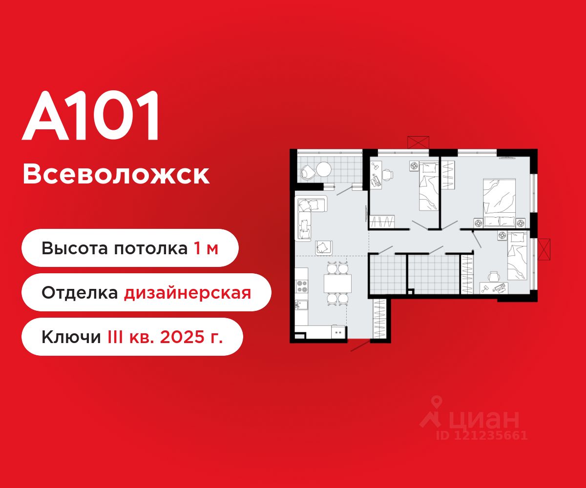 2-комнатная квартира площадью 78.30 в ЖК "А101 Всеволожск" на 2 этаже. Квартира с отделкой. Вид из окна на улицу. Высота потолков 2.95 м.