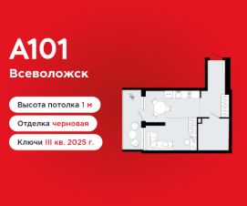 Студия площадью 39.20 в ЖК "А101 Всеволожск" на 1 этаже. Квартира без отделки. Вид из окна во двор. В квартире 1 санузел. Высота потолков 4.66 м. Особенность планировки - мезонин и патио.