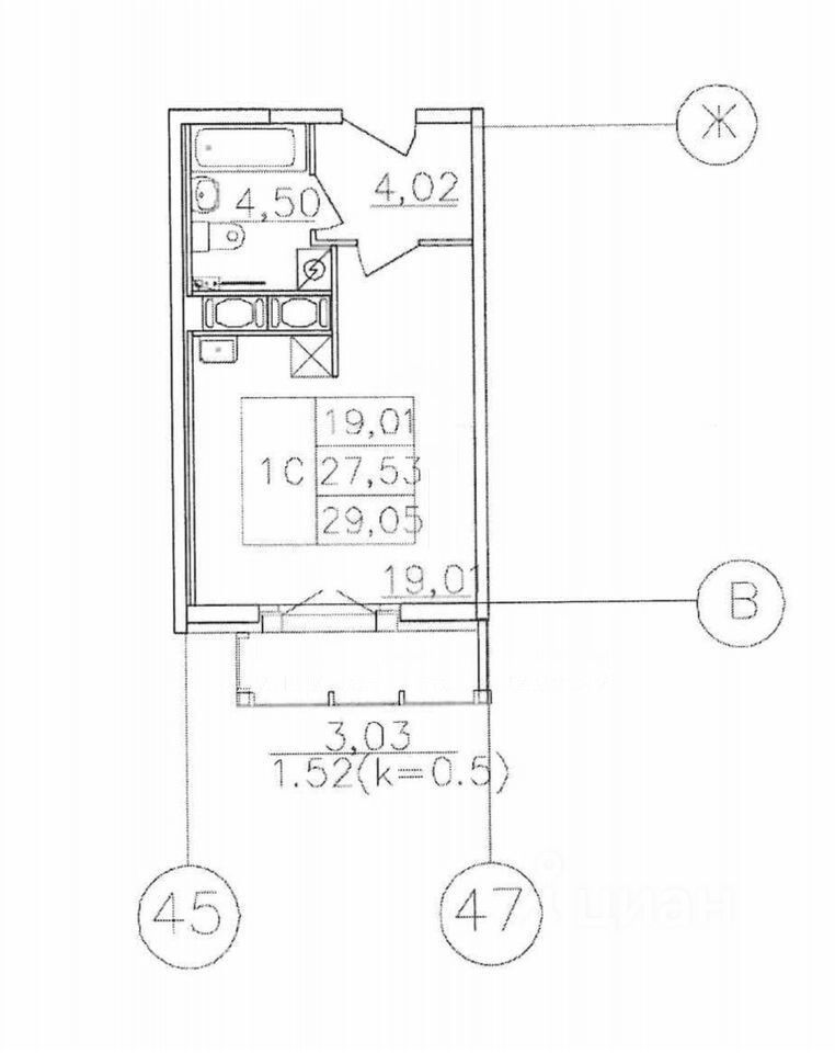Общая площадь студии составляет 30,8 кв. м, из которых 19 кв. м приходится на жилую площадь, а 5 кв. м — на кухню. Высота потолков 2,8 м создаёт ощущение простора. Лоджия добавляет удобства и возможности для отдыха.