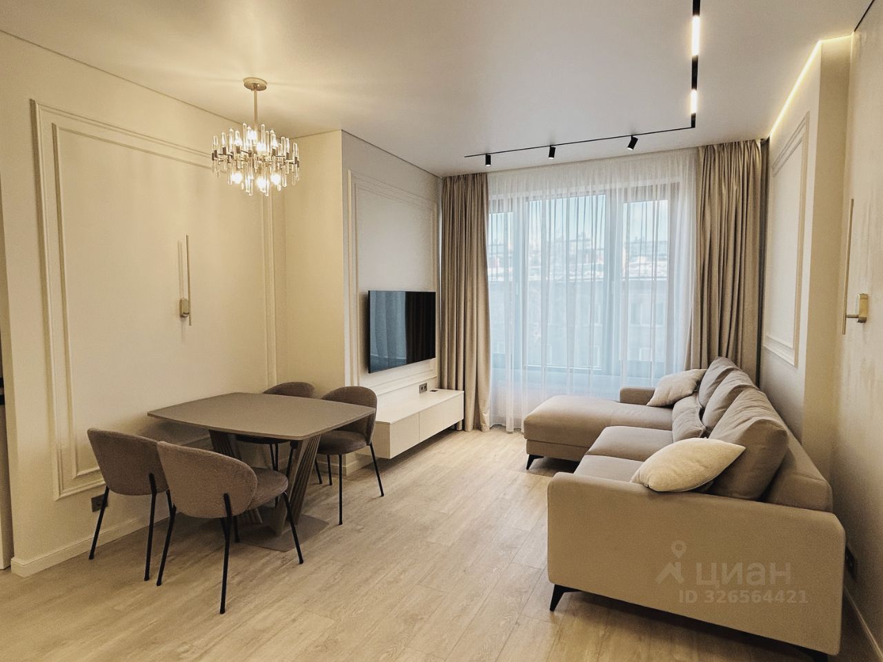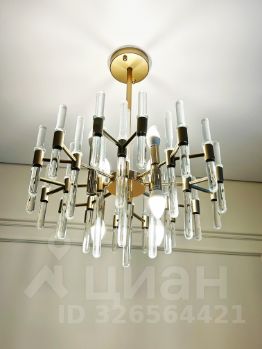 Во всей квартире красивые люстры, стильные лампы, полочки с подсветкой.