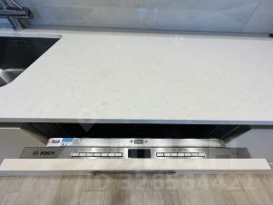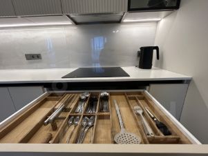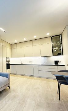 Кухня-гостиная 24 м., разделена на зону отдыха и приготовления. Установлен большой диван с телевизором, обеденный стол со стульями. Кухня оснащена подсветкой и всей необходимой встроенной техникой Bosh: варочная поверхность, посудомоечная машина, духовой шкаф, микроволновая печь, холодильник Sumsung, выдвижная вытяжка, теплая стена (для просушивания полотенец). Много ящиков и шкафов с доводчиками и стильной фурнитурой.