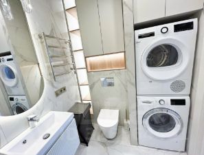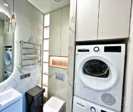 Детская 14,6 м. со входом в ванную комнату. Установлено зеркало с подсветкой, полотенцесушитель, стиральная и сушильная машины Bosh, шкаф и полки.