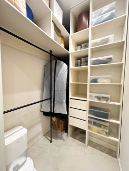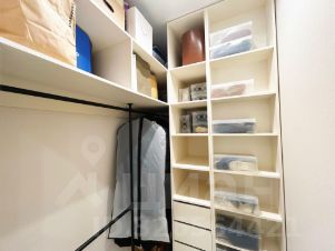 При входе предусмотрена гардеробная, оборудованная полками, штангой и ящиками. Много места для хранения. Также установлены шкаф и зеркало.