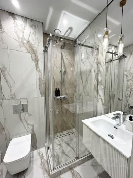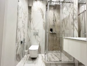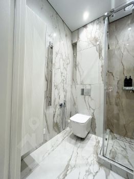 Второй санузел с душевой кабиной, полотенцесушителем и гигиеническим душем.