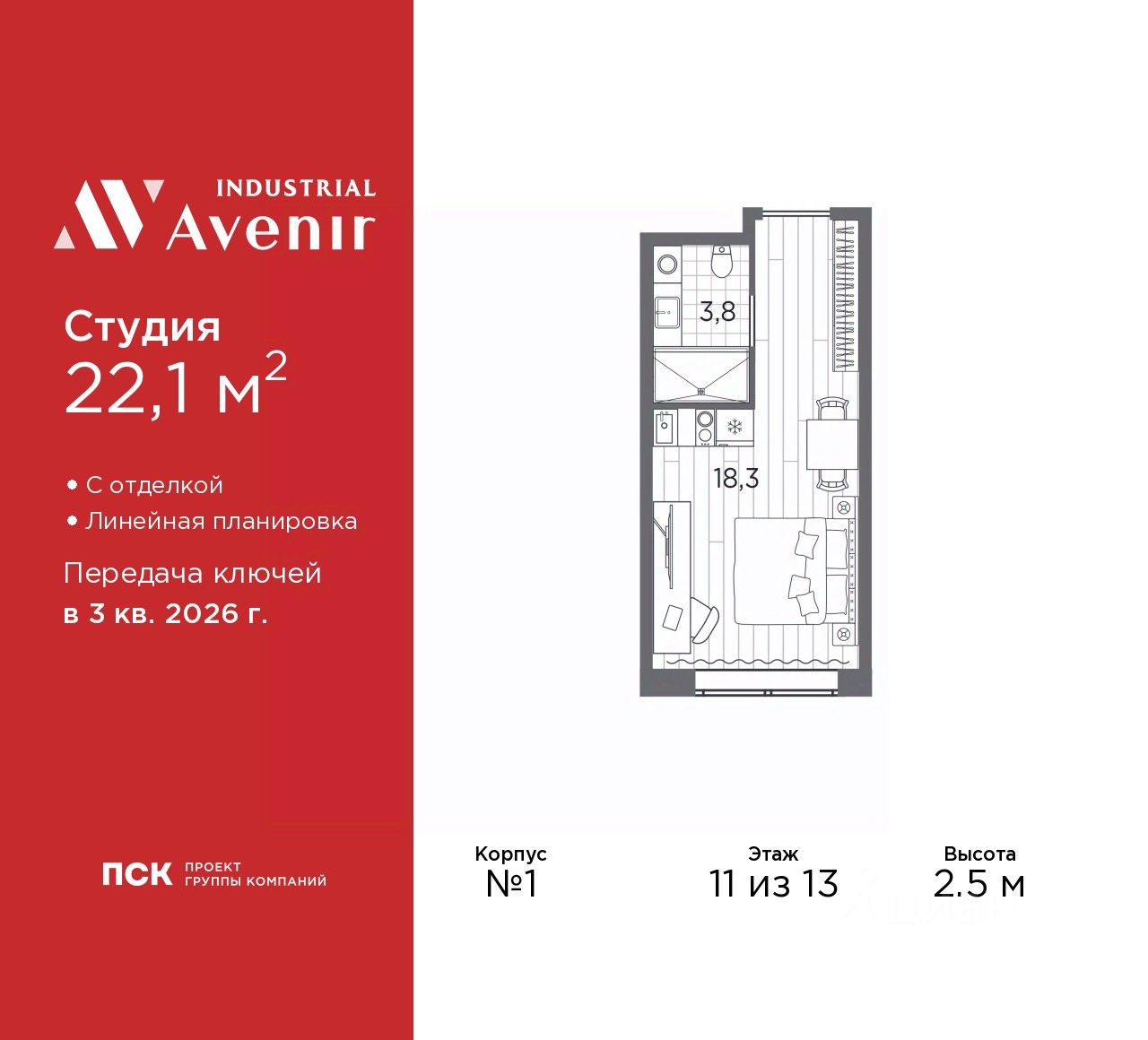 1-комн. апартаменты-студия от застройщика с отделкой в ЖК "Industrial AVENIR" на 11 этаже. Общая площадь: 22.1 кв.м., площадь гостиной 18.3 кв.м., из которых 5 кв.м. выделено под кухонную зону. Все окна выходят на одну сторону. В апартаментах один совмещенный санузел. Высота потолков 2.5 м.