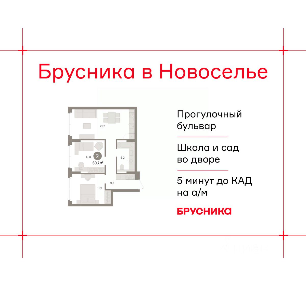 2-комн. квартира с предчистовой отделкой в ЖК "Брусника в Новоселье" на 1 этаже. Общая площадь: 60.69 кв.м., жилая: 23.7 кв.м., площадь просторной кухни-столовой: 21.2 кв.м. Комнаты изолированные, все окна выходят на одну сторону. В квартире один совмещенный санузел. Высота потолков 2.7 м.