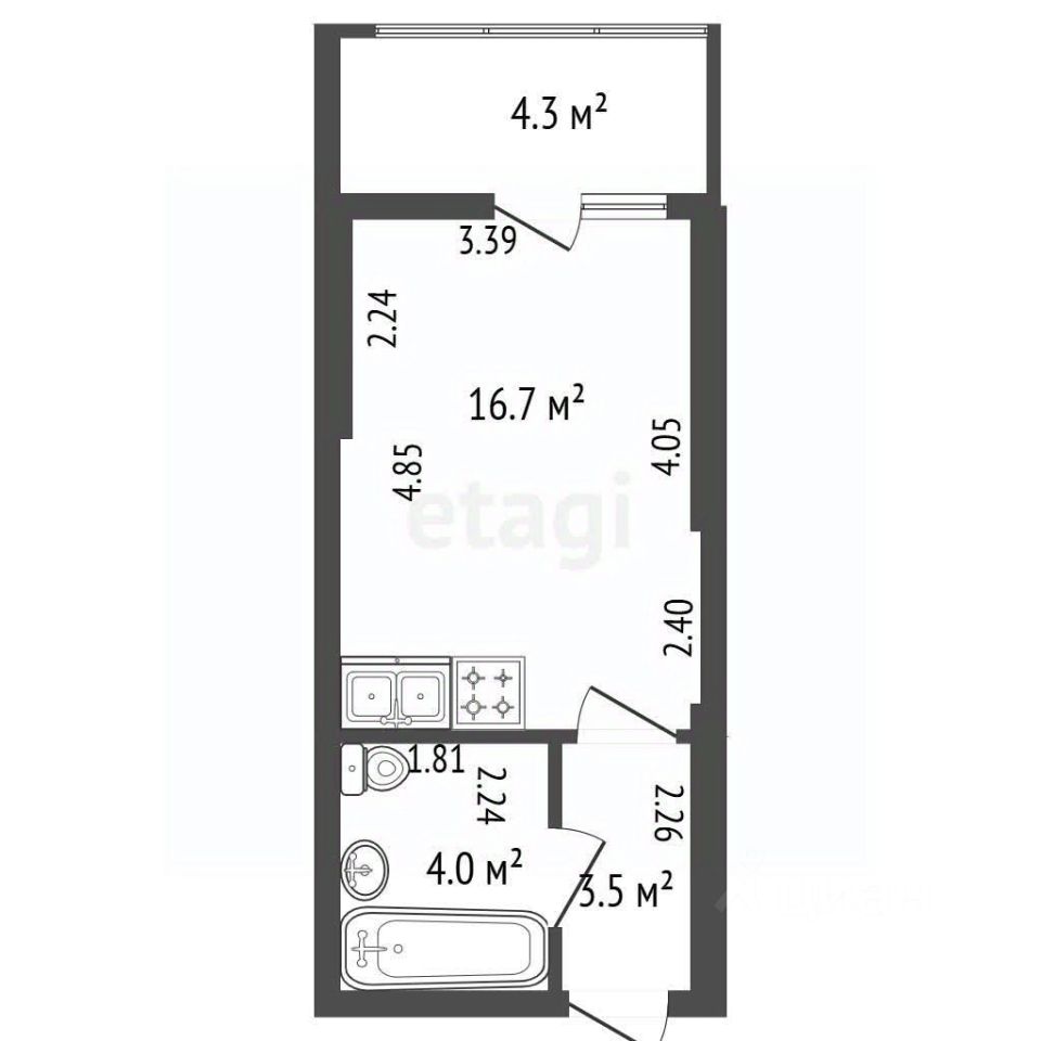 Продается современная студия с качественным ремонтом в районе с развитой инфраструктурой. Общая площадь квартиры составляет 24.2 м², включая просторный застекленный балкон 4.9 м² с видом на открытое пространство.