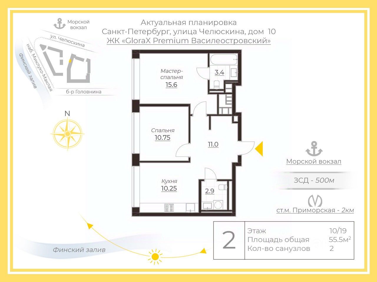 Арт. 129360301 Продаётся квартира 55м² в современном премиальном проекте GloraX Premium Василеостровский по адресу Санкт-Петербург, ул. Челюскина, 10, стр. 1 (Василеостровский район, МО Морской).
