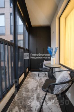 Просторная застекленная лоджия с местом для отдыха и вместительной системой хранения.