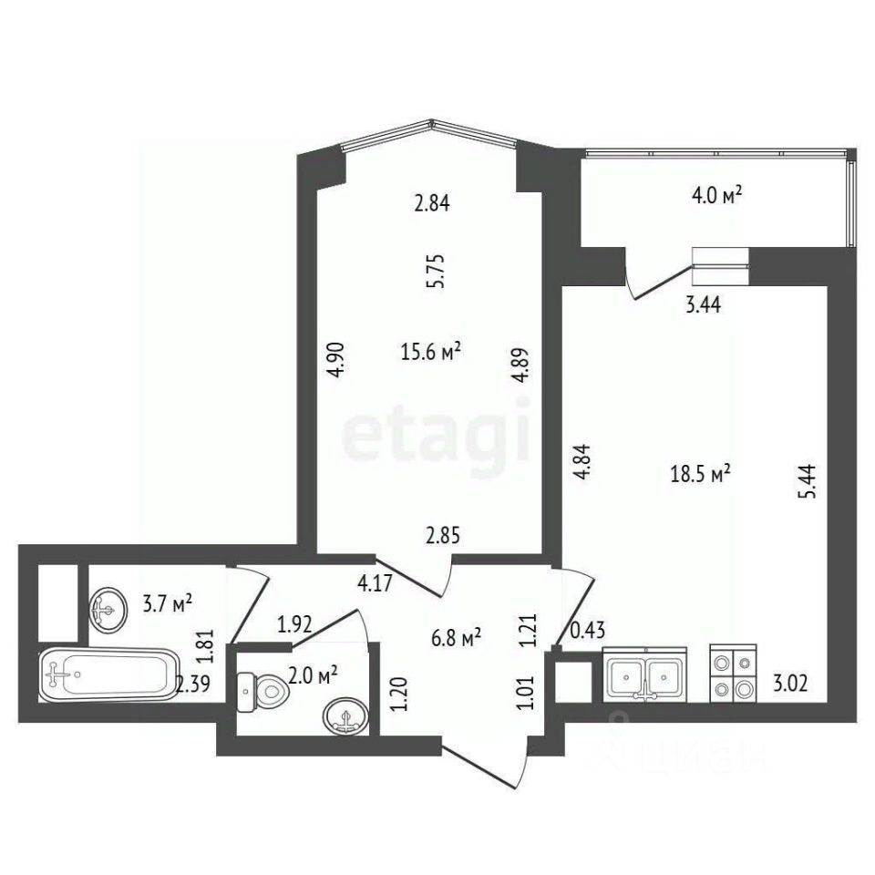 • Площадь: 46,6 м² + просторная лоджия 4 м².