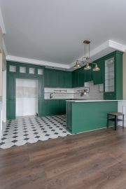 На кухне установлены: каменная мойка Omoikiri, светодиодная подсветка, встроенная посудомоечная машина Hotpoint Ariston шириной 60 см, вытяжка Elica, электрический духовой шкаф Bosch, встраиваемая электрическая панель Samsung;