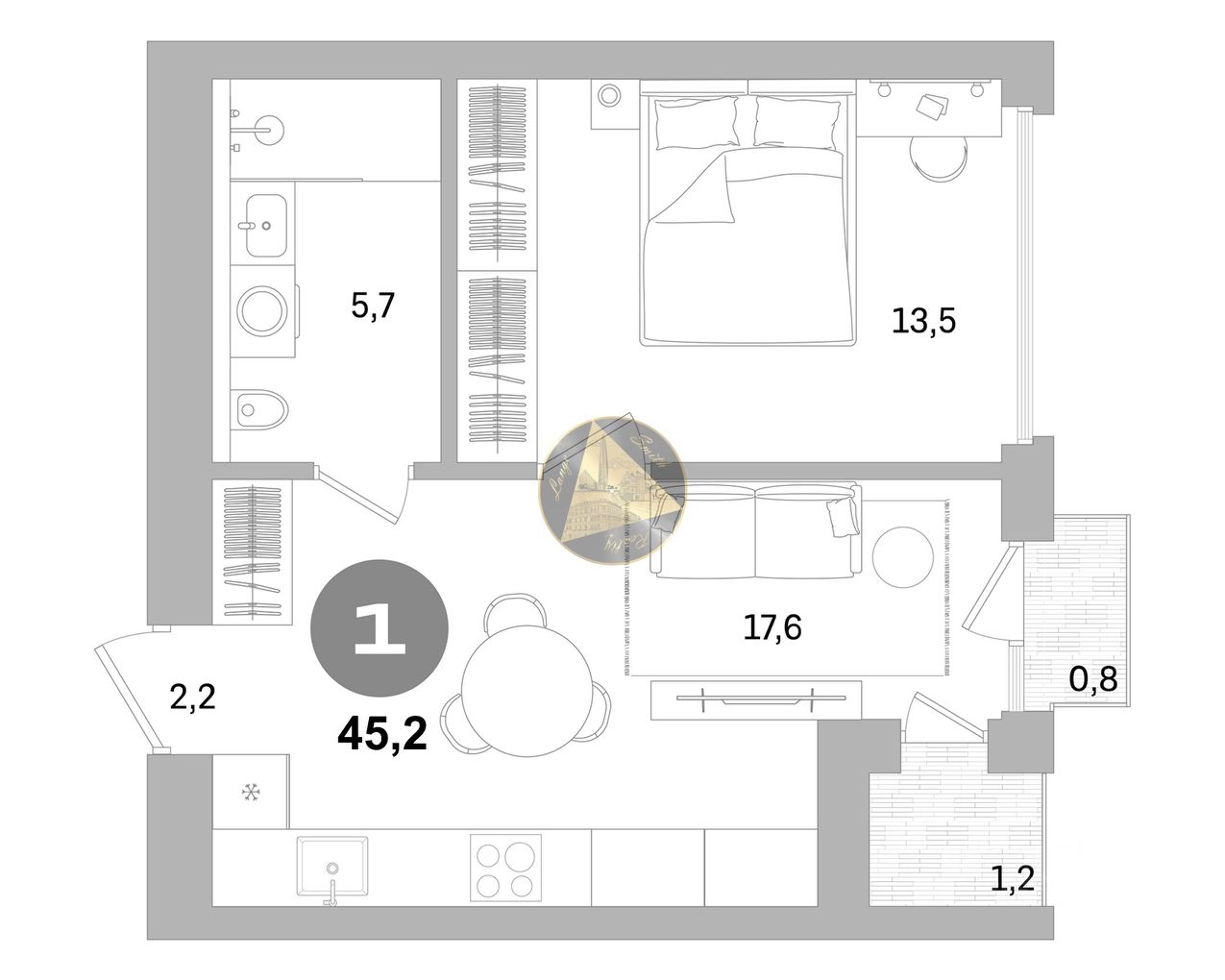 Балкон 0.8 м2. Техническая лоджия 1.2 м2.