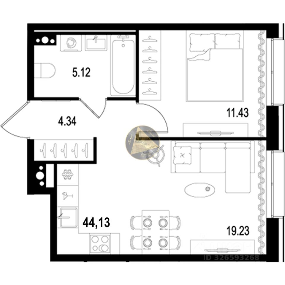 Квартира находится на 6/10 этаже. Общая площадь квартиры 44.13 м2.