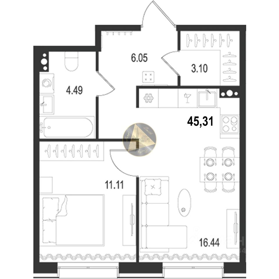 Квартира находится на 6/10 этаже. Общая площадь квартиры 45.31 м2.