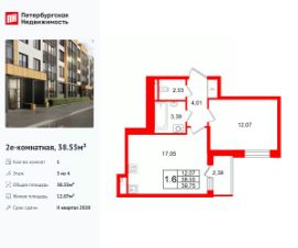 Удобная, классическая, функциональная европланировка, большая кухня-гостиная 17.05 м², вместительная прихожая 4.01 м². Общая площадь квартиры - 38.55 м², жилая 12.07 м², высота потолка 2.77 м.