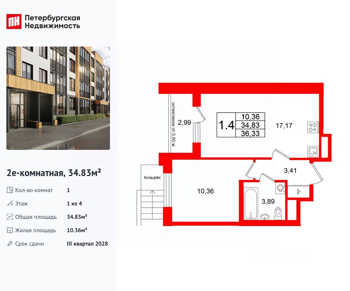 Удобная, классическая, функциональная европланировка, большая кухня-гостиная 17.17 м², вместительная прихожая 3.41 м². Общая площадь квартиры - 34.83 м², жилая 10.36 м², высота потолка 2.77 м.