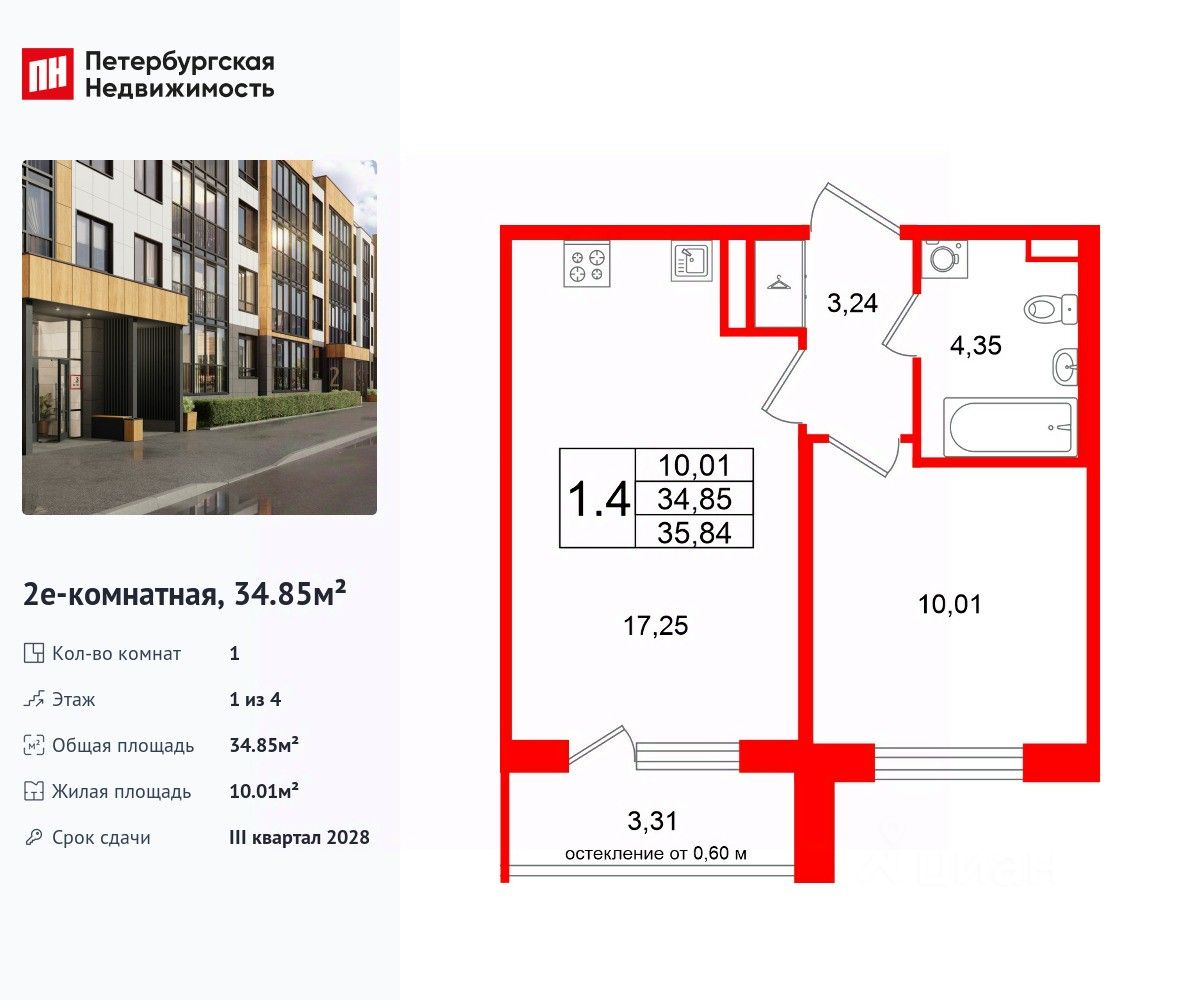 Удобная, классическая, функциональная европланировка, большая кухня-гостиная 17.25 м², вместительная прихожая 3.24 м². Общая площадь квартиры - 34.85 м², жилая 10.01 м², высота потолка 2.77 м.