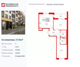 Уникальная, функциональная европланировка, большая кухня-гостиная 17.26 м², вместительная прихожая 6.41 м². Общая площадь квартиры - 57.02 м², жилая 26.31 м², высота потолка 3.07 м.