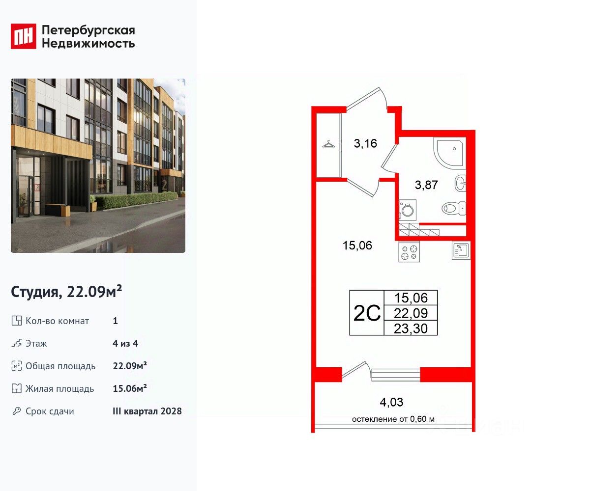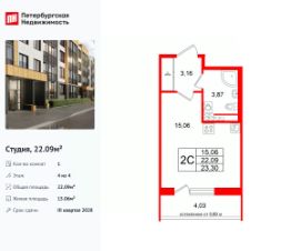 Удобная, классическая, функциональная европланировка, вместительная прихожая 3.16 м². Общая площадь студии - 22.09 м², жилая 15.06 м², высота потолка 3.07 м.