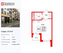 Удобная, классическая, функциональная европланировка, вместительная прихожая 3.08 м². Общая площадь студии - 24.37 м², жилая 18.06 м², высота потолка 3.07 м.