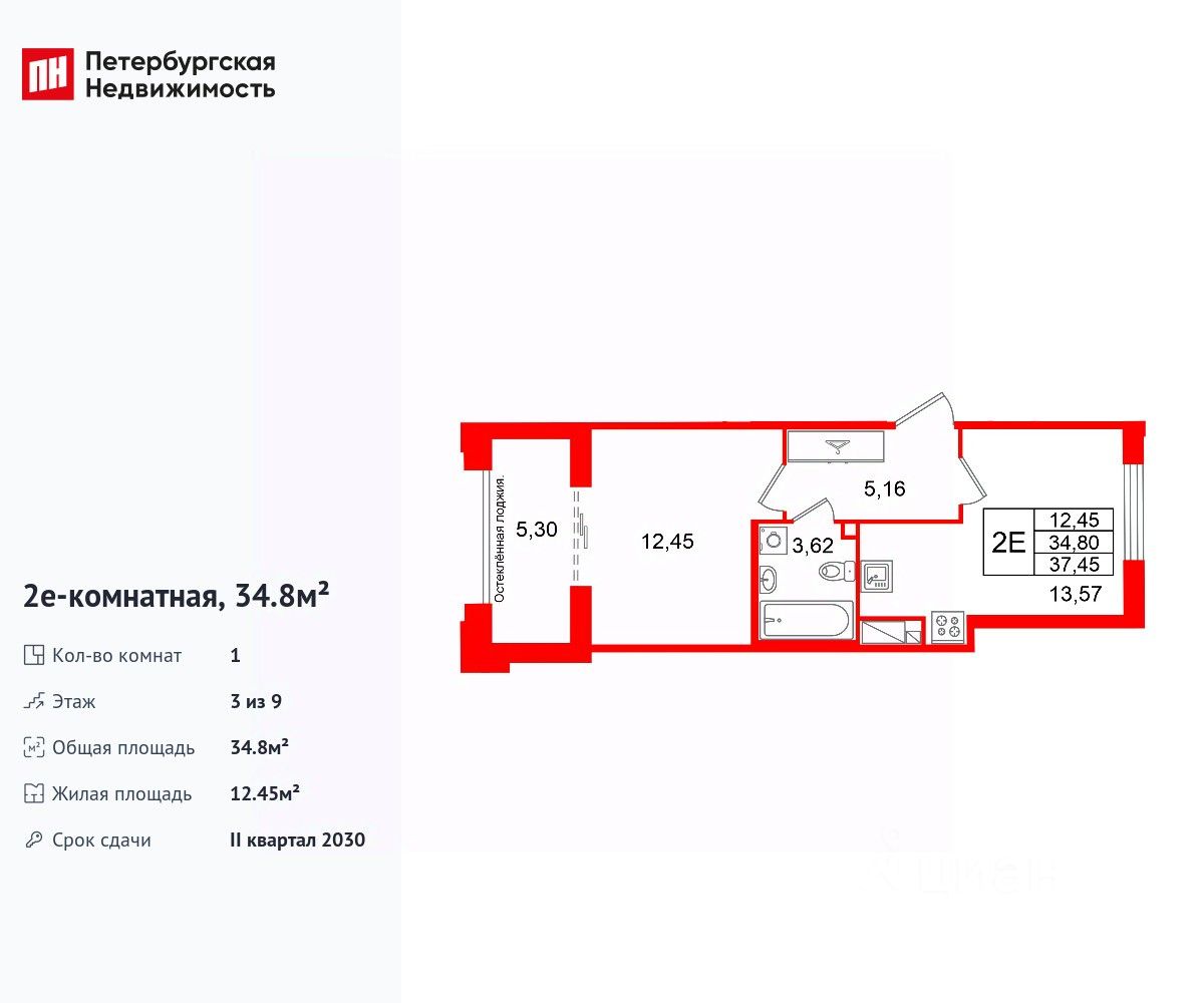 Удобная, классическая, функциональная европланировка, большая кухня-гостиная 13.57 м², просторная прихожая 5.16 м². Общая площадь квартиры - 34.8 м², жилая 12.45 м², высота потолка 3 м.