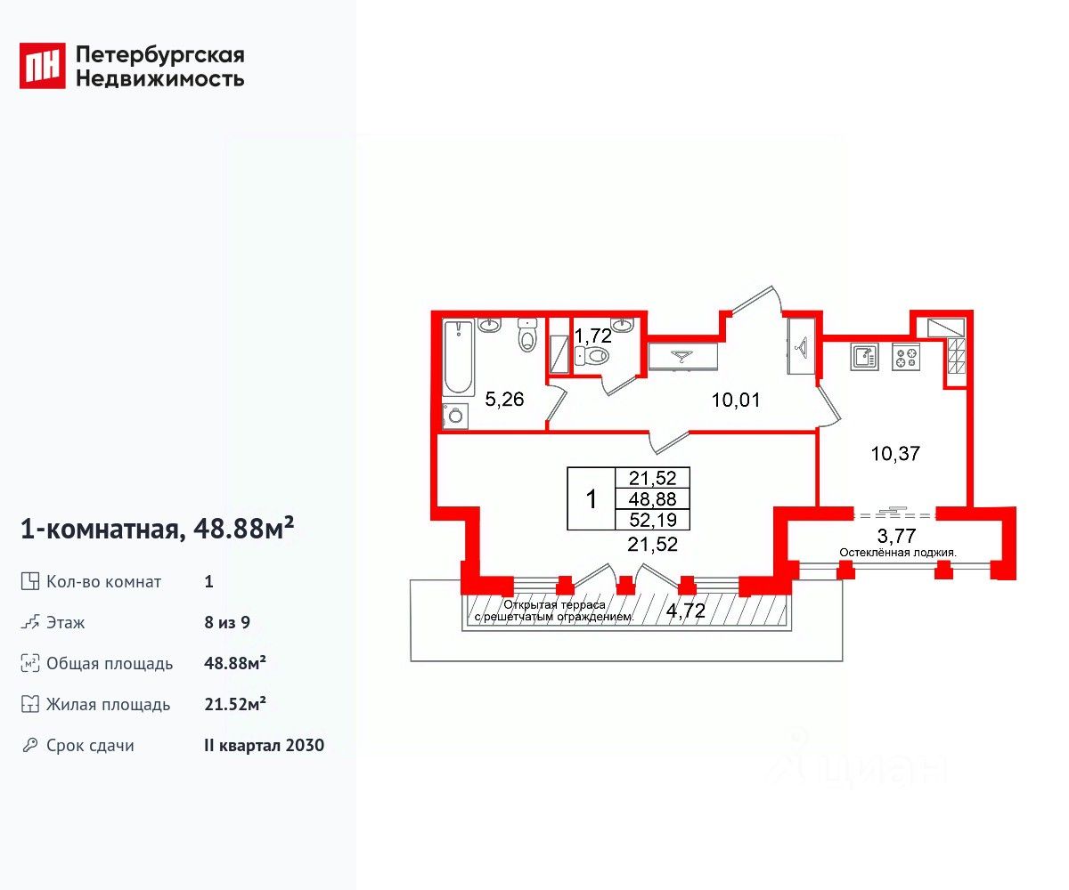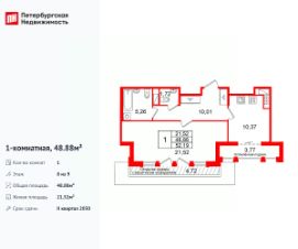Удобная, классическая планировка, кухня 10.37 м², просторная прихожая 10.01 м². Общая площадь квартиры - 48.88 м², жилая 21.52 м², высота потолка 3 м.