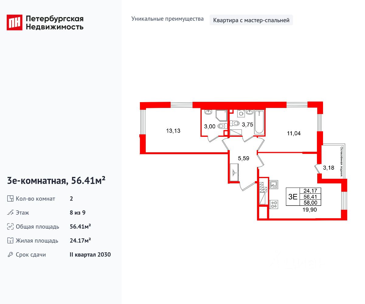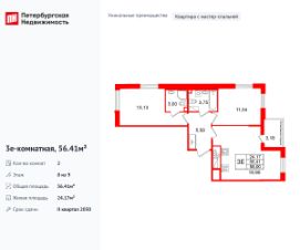 Уникальная, функциональная европланировка, большая кухня-гостиная 19.9 м², вместительная прихожая 5.59 м². Общая площадь квартиры - 56.41 м², жилая 24.17 м², высота потолка 3 м.