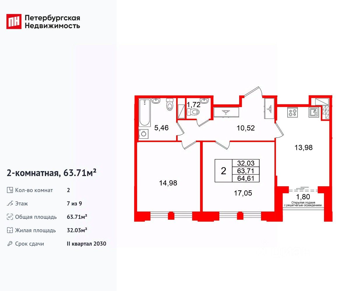 Удобная, классическая планировка, кухня 13.98 м², просторная прихожая 10.52 м². Общая площадь квартиры - 63.71 м², жилая 32.03 м², высота потолка 3 м.