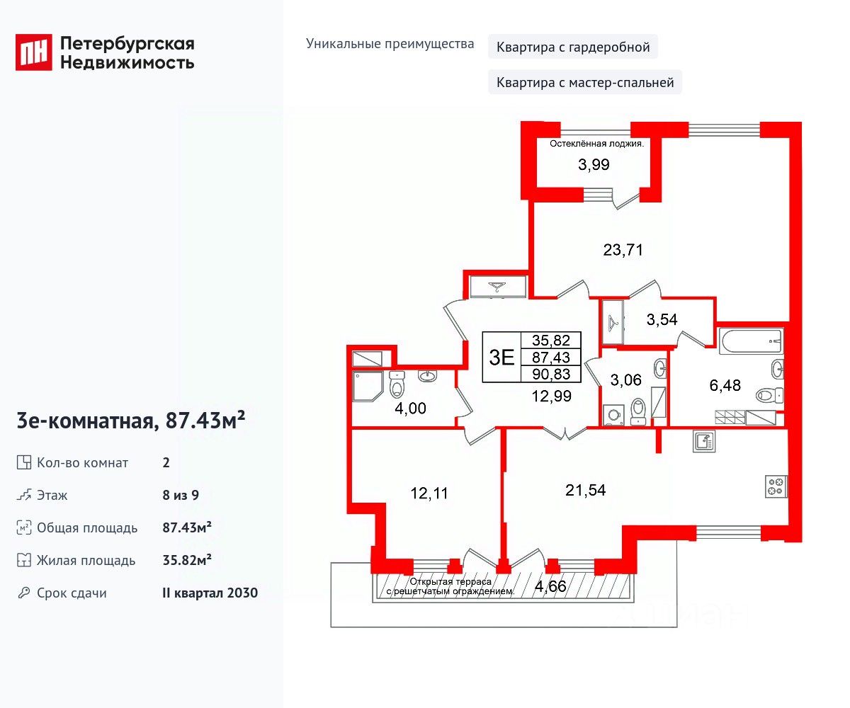 Уникальная, функциональная европланировка, большая кухня-гостиная 21.54 м², просторная прихожая 12.99 м². Общая площадь квартиры - 87.43 м², жилая 35.82 м², высота потолка 3 м.