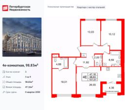Уникальная, функциональная европланировка, большая кухня-гостиная 26.55 м², просторная прихожая 11.82 м². Общая площадь квартиры - 98.83 м², жилая 47.16 м², высота потолка 3 м.