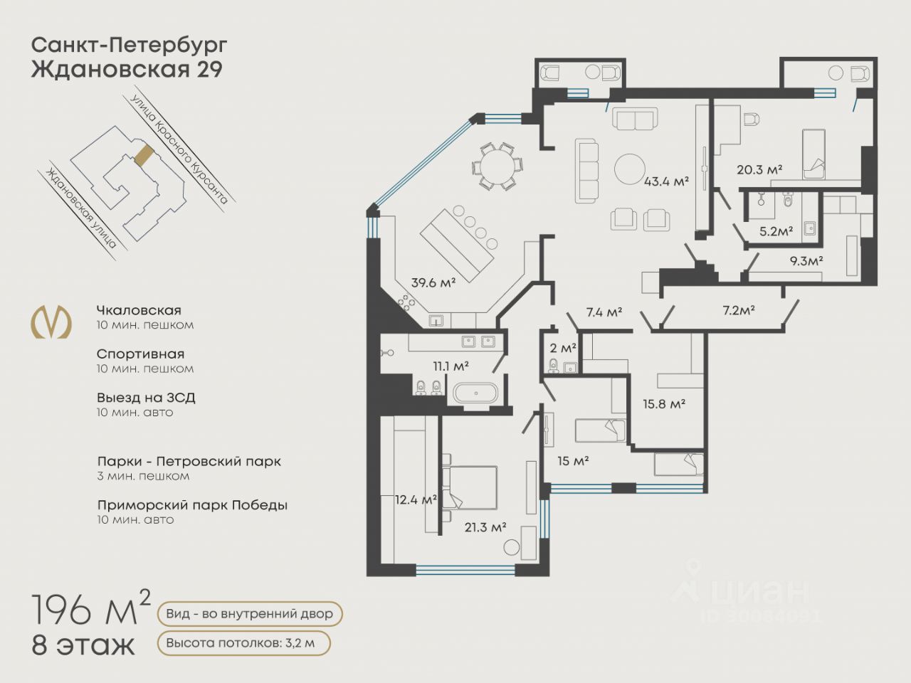 Арт. 129418500 Эксклюзивная квартира с тремя спальнями в комплексе "Идеальный Мир" на Петроградской стороне