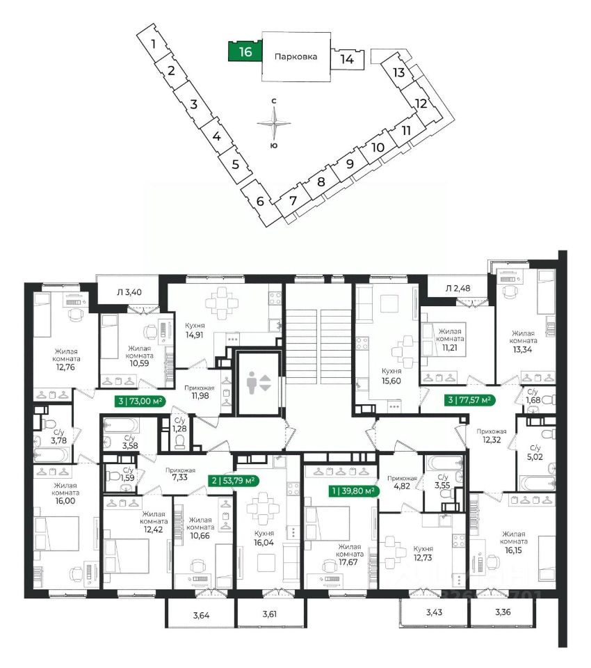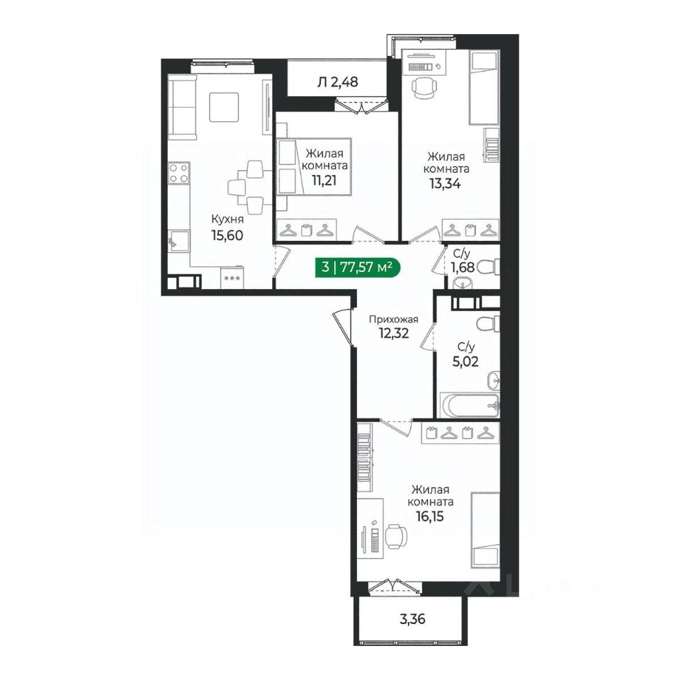 2 квартира на 8 этаже общей площадью 77,57 м² в IV очереди в жилом комплексе Сертолово Парк от застройщика ГК Алгоритм.