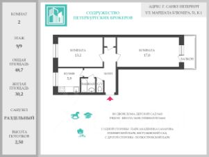 Двухкомнатная квартира в окружении парков и садов! Окна выходят на две стороны, панорамный вид, в окружении зелени. Общая площадь 48,7 кв. м., две раздельные комнаты 13,2 кв.м. и 17 кв.м., кухня квадратной формы 6 кв.м. Большие окна - квартира очень светлая и солнечная! На высоком 9-ом этаже, никто не топает над головой!