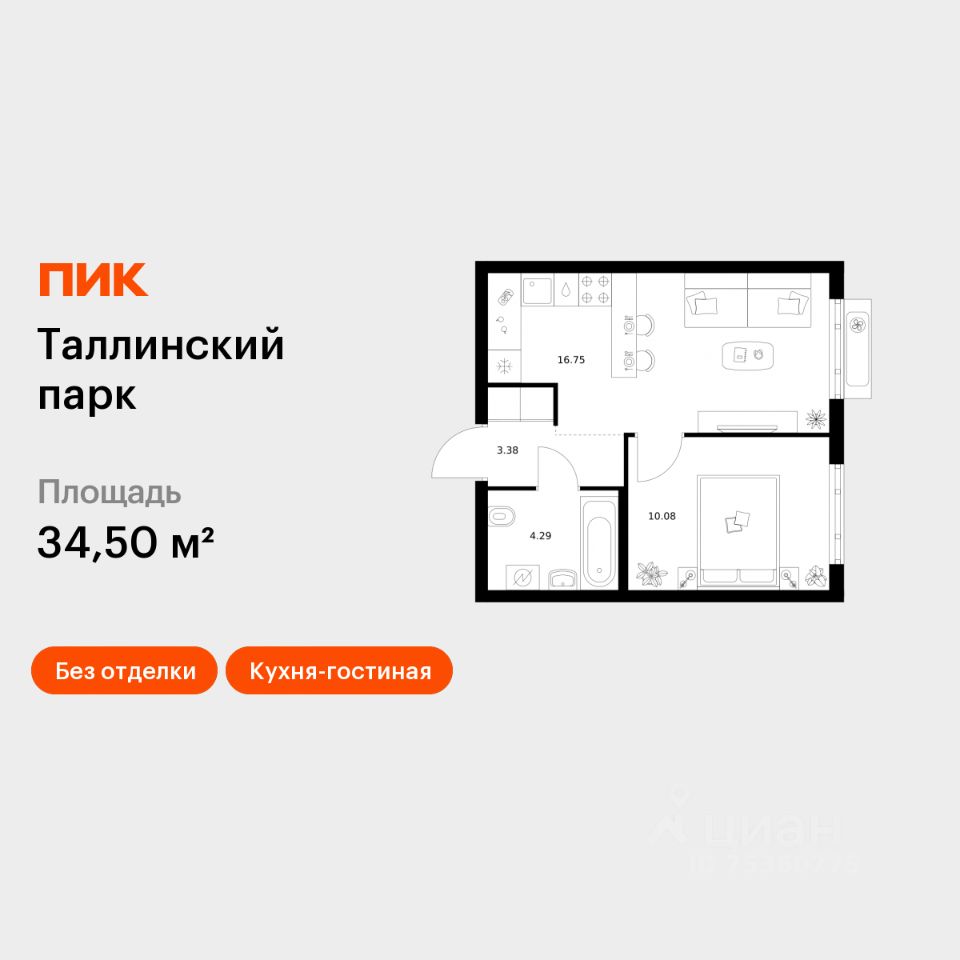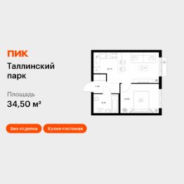 Продаётся 1-комн. квартира площадью 34,5 кв.м на 12 этаже 12 этажного дома (Корпус 4.2, Секция 1) проекта ПИК Таллинский парк. Светлый просторный подъезд на уровне земли, функциональная планировка, большие окна, без отделки.