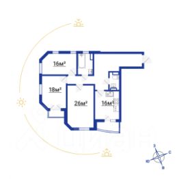 - Три изолированные комнаты: 26 м, 18 м, 16 м.