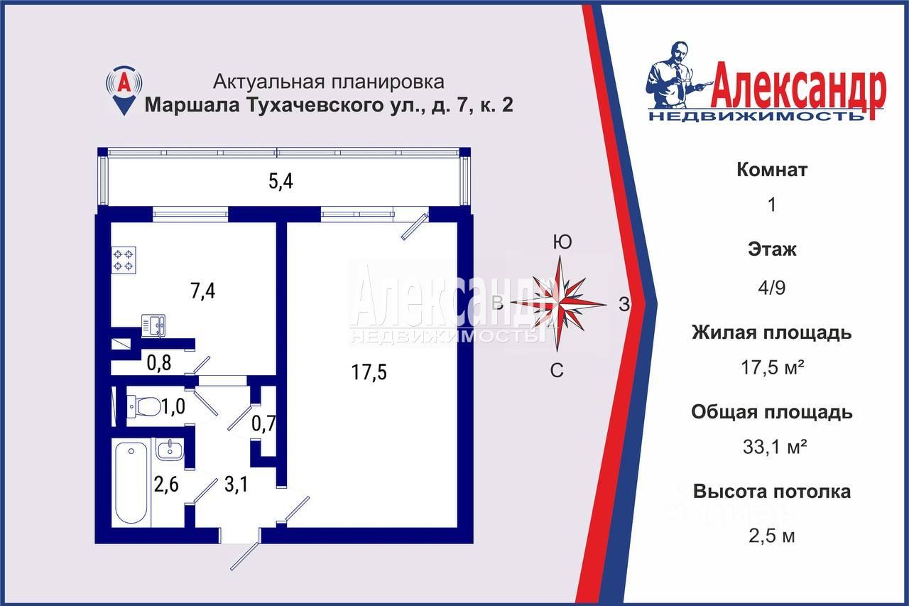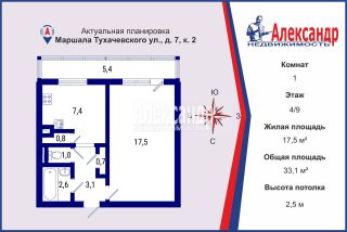 О квартире: общая площадь 33.1 м²., комната 17.5 м²., кухня 7.4 кв.м., с.у раздельный. В комнате установлен огромный шкаф-купе, на кухне и в коридоре - встроенные шкафы-кладовые. Мест для хранения предостаточно.