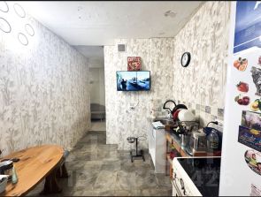 Комната нуждается в косметическом ремонте, не срочно, но со временем и по возможностям следует заняться потолком (есть дефекты побелки), переклеить обои. На окнах стеклопакеты. Пол в комнате ламинат, на кухне и в прихожей линолеум полукоммерческий.