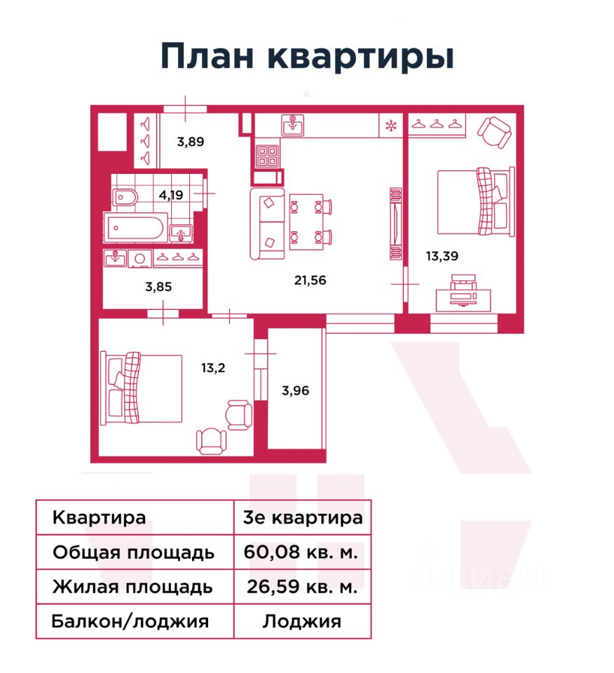 • 2 комнаты, общая площадь 60,08 м², жилая — 26,59 м².