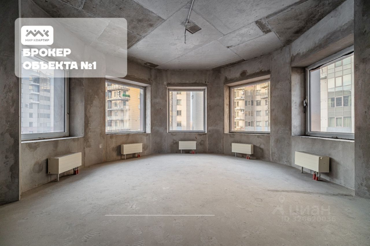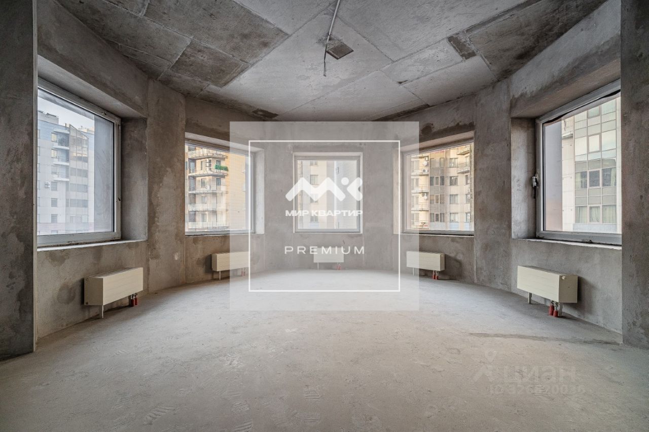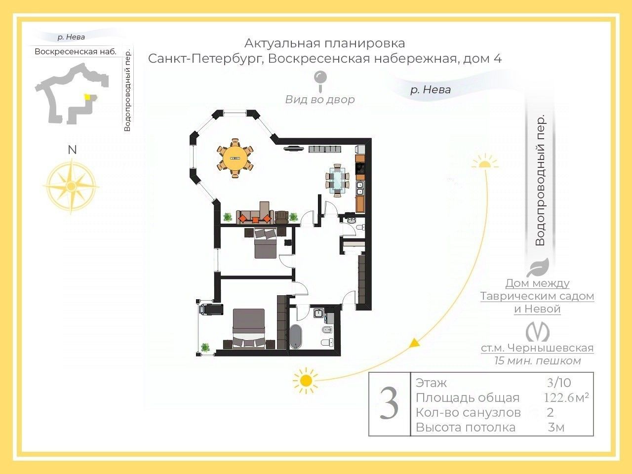 Квартира расположена на 3 этаже, общей площадью 123 кв. м., включает в себя две полноценные изолированные спальные комнаты 25,8 м2+15,2 м2 и просторную, светлую, полукруглую кухню-гостиную с эркером 53,9 м2, холл 16,9 м2, гардеробная 0,8 м2, совмещенный санузел 8 м2, гостевой санузел 2 м2 . высота потолка 3м.