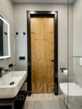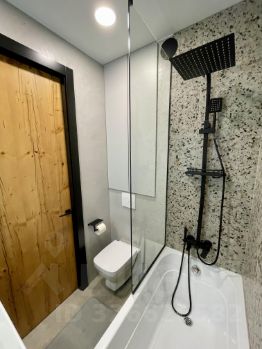 Совмещенный санузел 2,92 м2 с полноценной ванной и дизайнерской дверью высотой 2300 мм из эксклюзивного шпона.