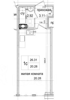 Комната 20,28 м2 поделена на зону отдыха и кухни.