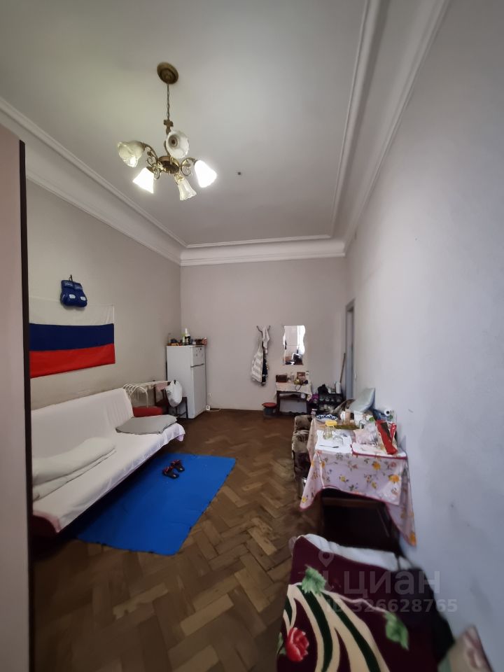 Площадь комнаты - 25,6 кв.м. В комнате 2 бoльшиx окнa, высoкие потолки 3,5 м, из окон в тихий, закрытый двор. Семь лет назад в комнате сделан косметический ремонт.