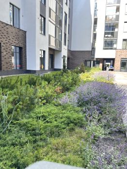 - Во дворе разбит полноценный дендропарк с геопластикой, разнообразными видами цветов, растений и кустарников. Растения специально подобраны таким образом, чтобы каждый сезон радовать жителей яркими красками;