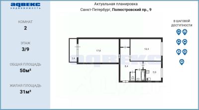 Приятный микрорайон, утопает в зелени, центр в 15 минутах на авто. Инфраструктура, о которой можно только мечтать — всевозможные магазины, "Пятёрочка" в соседнем доме, пекарня с ароматным кофе и горячими обедами в 50 м от дома, общественный транспорт во все районы города, до набережной Невы 1,5 км, до Большеохтинского моста 10 минут на авто. В 15 минутах пешком — Полюстровский рынок, пешком поликлиника, школа, гимназия.