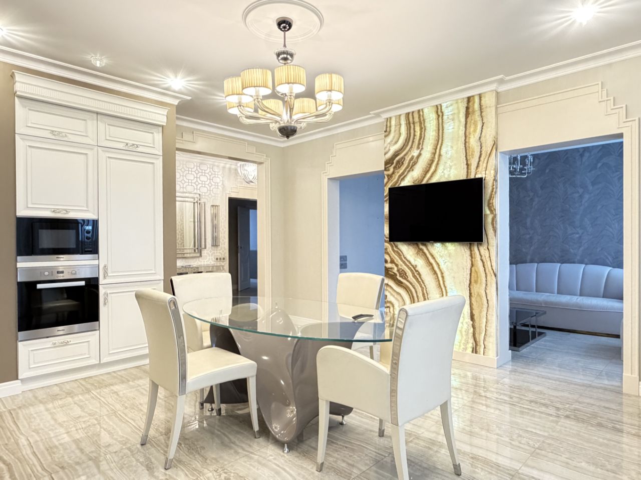Авторский дизайн-проект, дорогие материалы, мебель и техника (входит в стоимость). Особенная изюминка интерьера — стена из натурального оникса, создающая неповторимую игру света и элитную атмосферу.