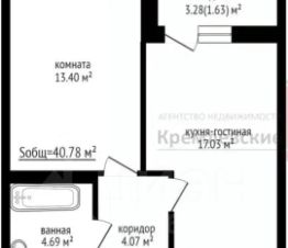 Общая площадь без понижающего коэффициента применяемого к лоджии 42,47 кв.м. Общая площадь с понижающим коэффициентом 40,2 кв.м.
